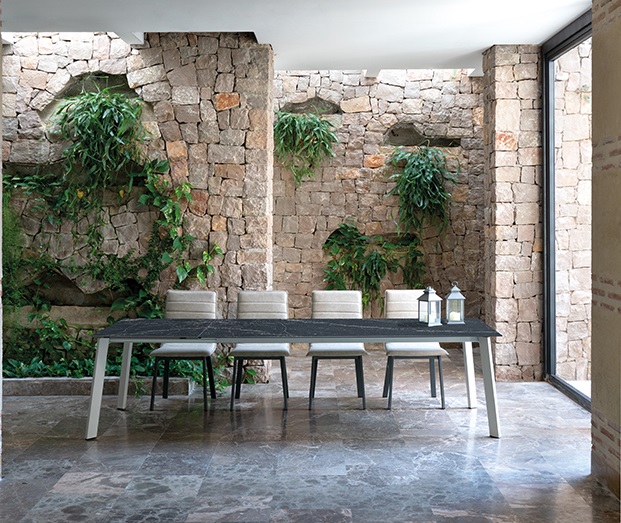 Hochbeständige Oberflächen: Die Tischplatte und die Verlängerungen bestehen wahlweise aus hochwertiger Keramik oder Dekton® von Cosentino . Diese porenfreien Oberflächen sind extrem kratzfest, fleckunempfindlich und hitzebeständig.