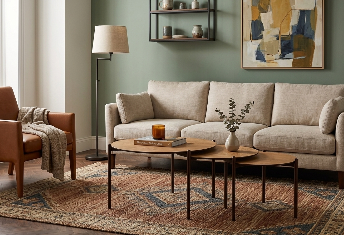 Mezcla de Acabados: Una de las ventajas de las mesas nido es la posibilidad de combinar materiales (ej. una tapa en Dekton® efecto mármol y otra en madera natural) para un look único.
