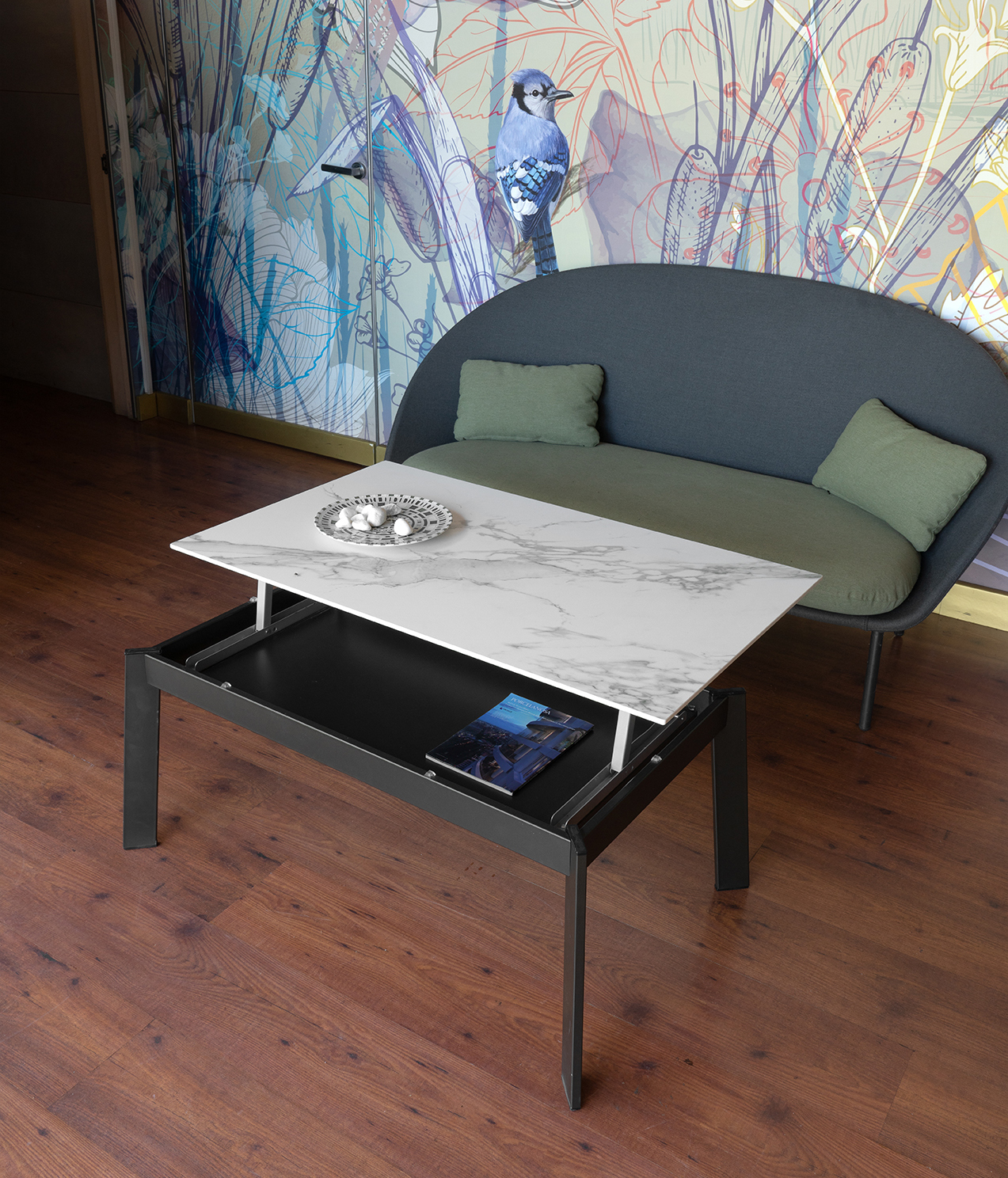 Más allá de su estética, la Tori es una solución inteligente para el día a día. Gracias a su sistema elevable, se transforma de una elegante mesa de centro de 42 cm en una superficie funcional de 56 cm, ideal para disfrutar de una cena ligera frente al televisor o trabajar con el ordenador desde la comodidad del sofá.