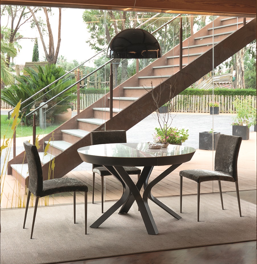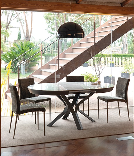 The Kron Extendable dining table elevates the concept of functionality without compromising its sculptural aesthetic. This model integrates an intelligent opening system that allows you to expand your dining space in seconds, all while maintaining the commanding presence of its curved steel plate base. It is the definitive solution for those seeking signature design combined with total adaptability.