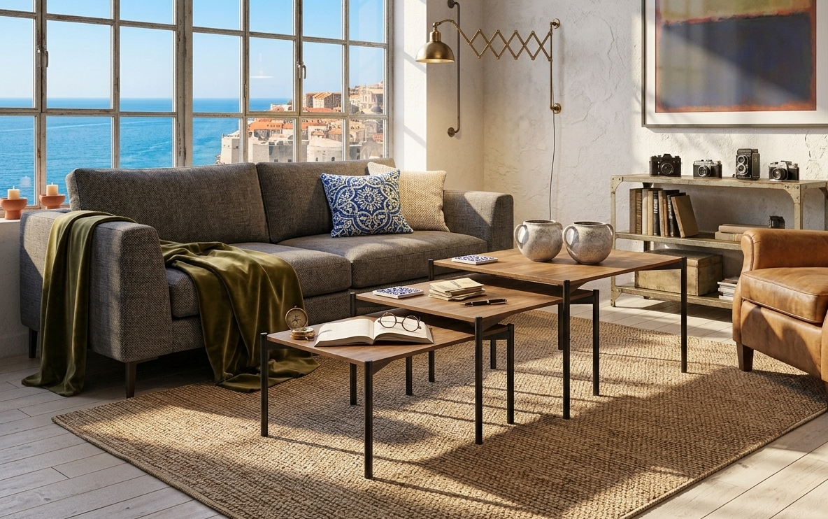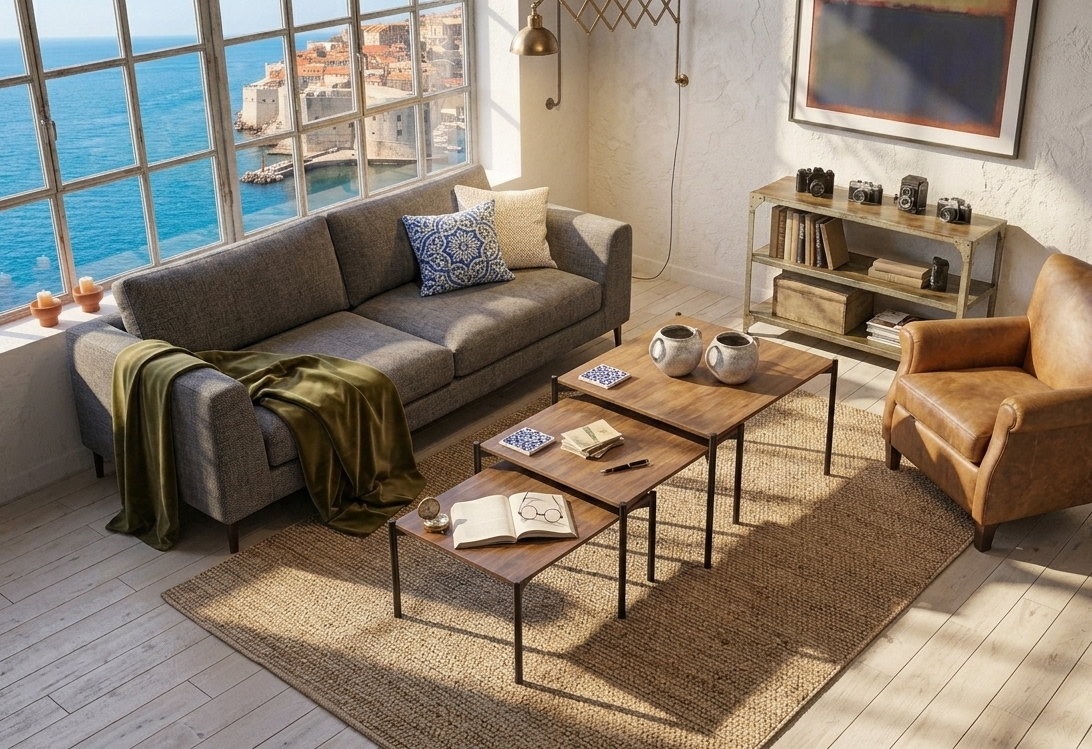 Mezcla de Acabados: Una de las ventajas de las mesas nido es la posibilidad de combinar materiales (ej. una tapa en Dekton® efecto mármol y otra en madera natural) para un look único.