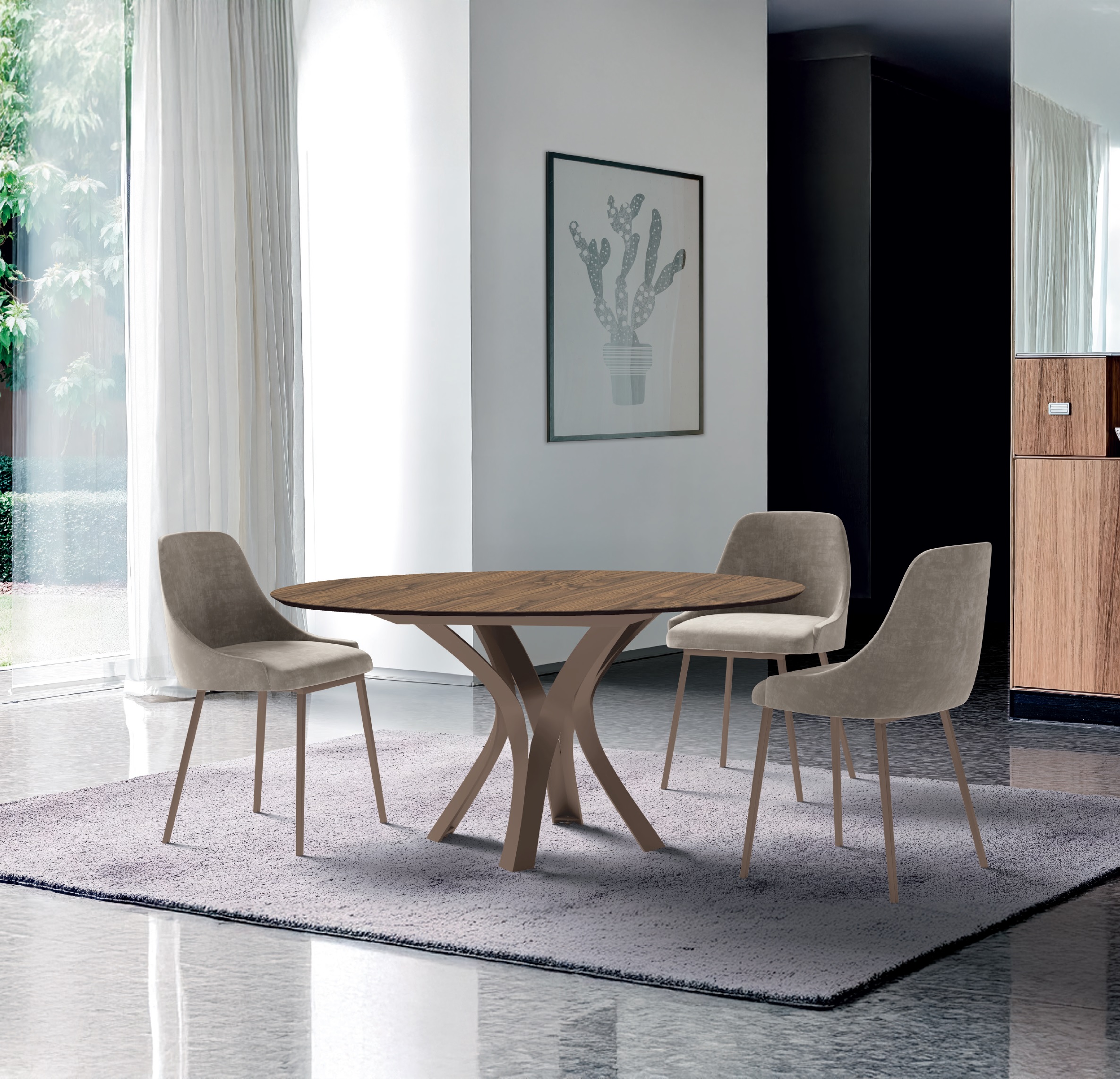 La table Kron Slim, avec son design plus compact et stylisé, s’accorde parfaitement avec les chaises qui suivent la même philosophie.